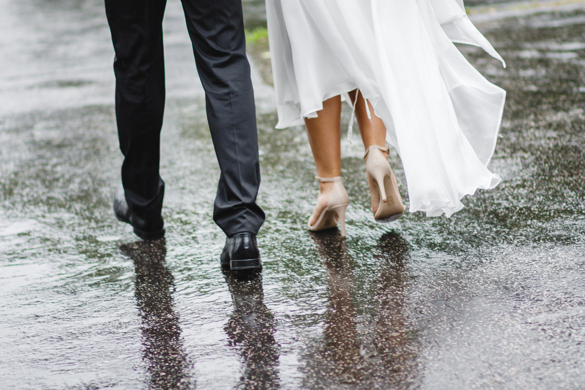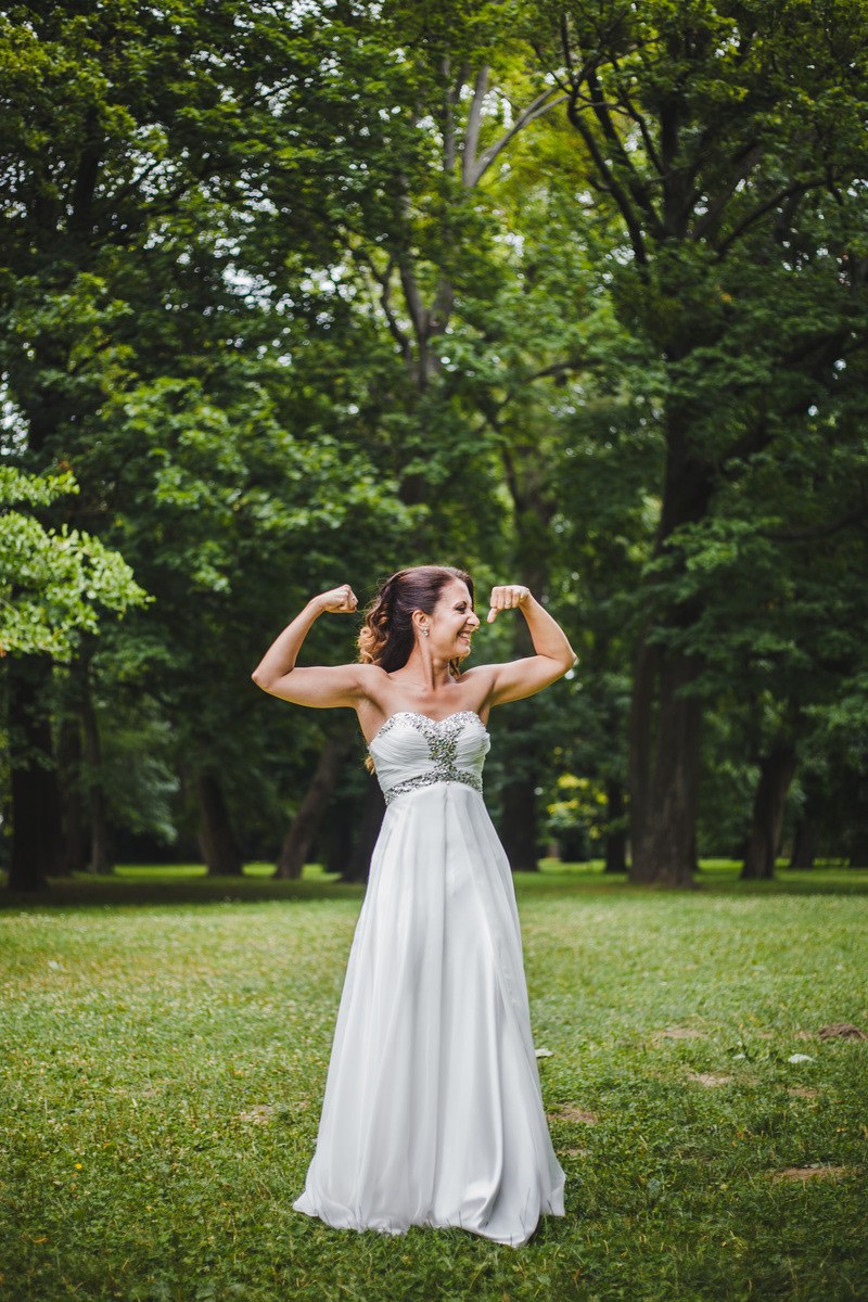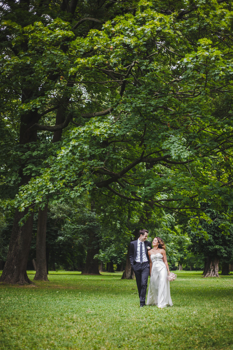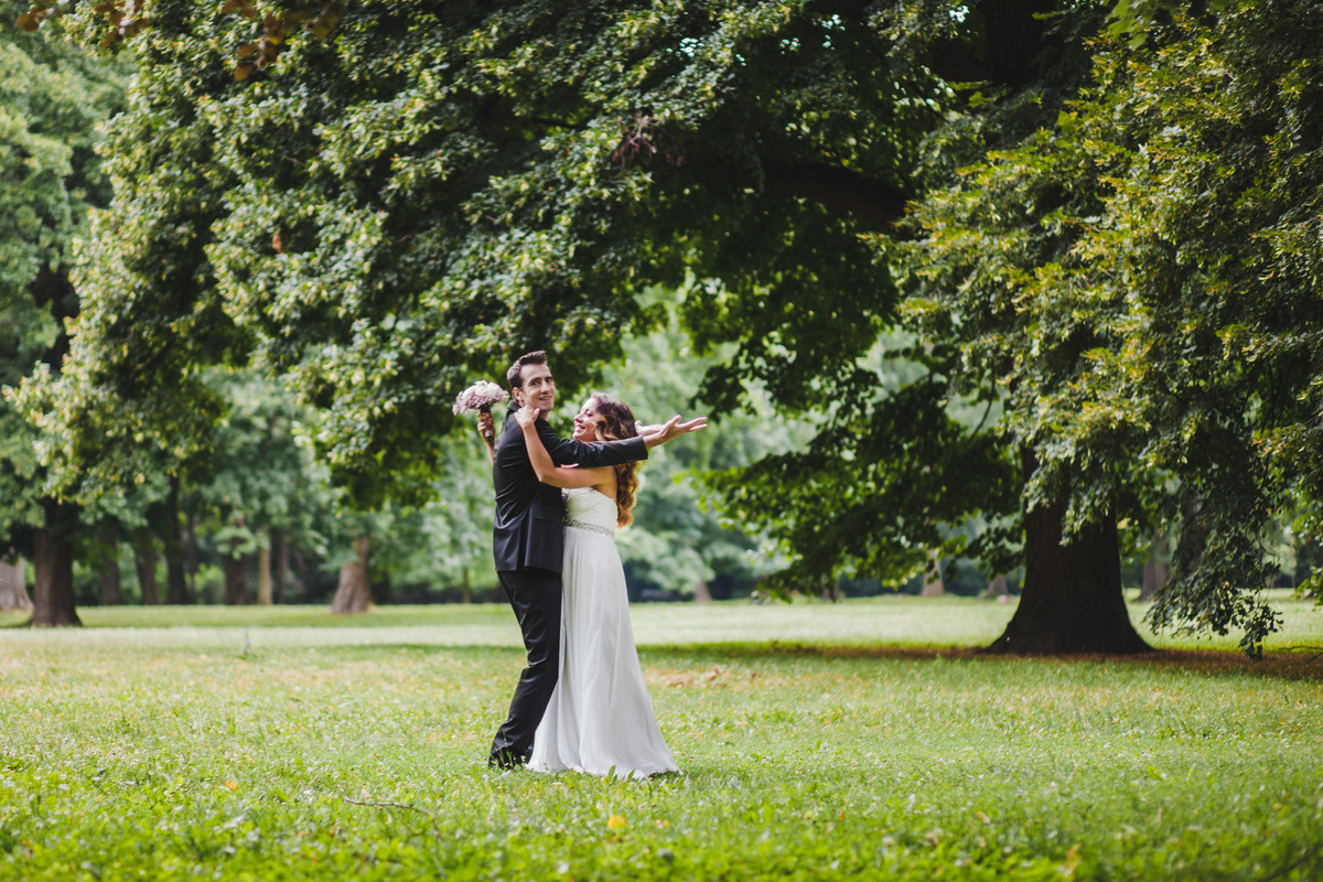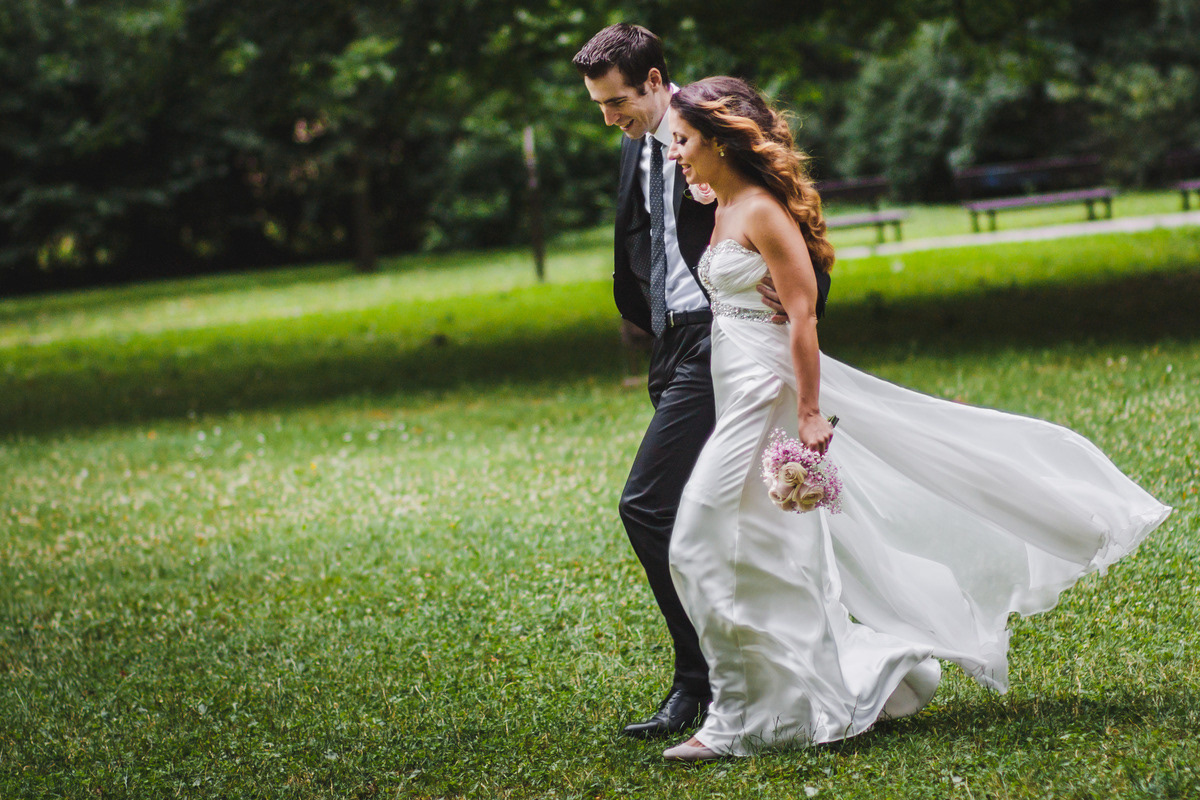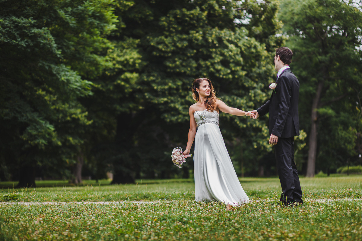 A young couple enjoying their wedding day in a relaxed, natural way - romantic and playful moments in the park, followed by a joyful celebration at their reception.