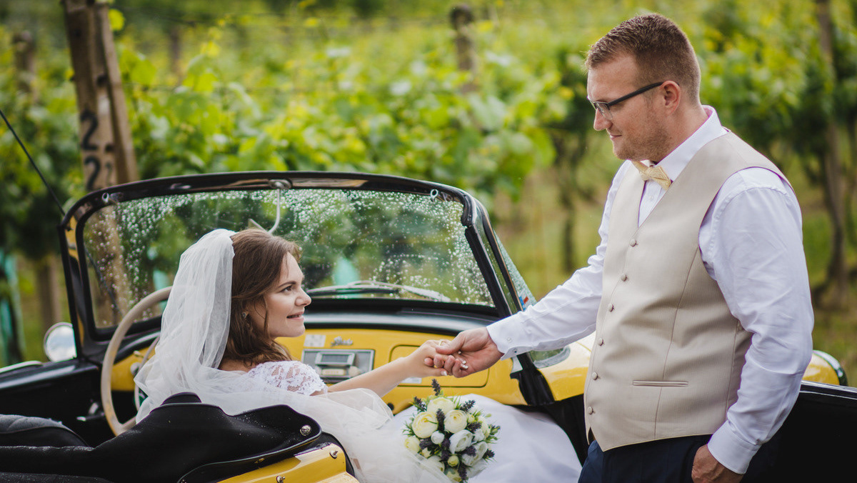 A joyful wedding day in Svätý Jur, spent in the vineyards, driving a vintage Felicia, and celebrating love with laughter.
